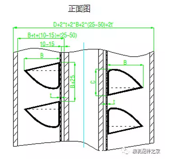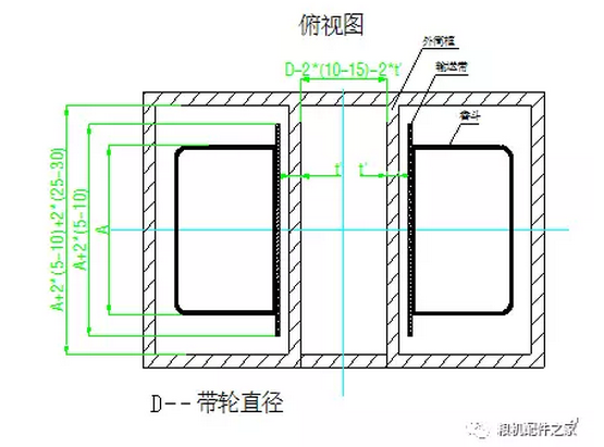 ◆斗式提升機(jī)的主要構(gòu)件選型 畚斗帶:斗提機(jī)頭,尾輪之間的牽引件。 長(zhǎng)度選擇:根據(jù)提升機(jī)提升高度選擇合適的長(zhǎng)度,一般將尾輪固定部件調(diào)松后提升至高位置(使的兩輪間距?。?,測(cè)量出長(zhǎng)度。 畚斗帶長(zhǎng)度=2*(頭、尾輪中心距)+頭輪直徑 寬度選擇:根據(jù)提升機(jī)單個(gè)機(jī)桶長(zhǎng)寬尺寸選擇合適的寬度, 畚斗帶寬度:=單個(gè)機(jī)桶寬度-2*(25-30mm) 畚斗帶型號(hào)選擇:根據(jù)提升高度,頭、尾輪直徑,物料特性及提升產(chǎn)量選擇合適的畚斗帶型號(hào)。一般需要經(jīng)過詳細(xì)的計(jì)算。 畚斗:斗提機(jī)裝載物料的零件。 畚斗長(zhǎng)寬選擇:根據(jù)機(jī)桶尺寸及畚斗帶尺寸選擇合適的尺寸。如下圖